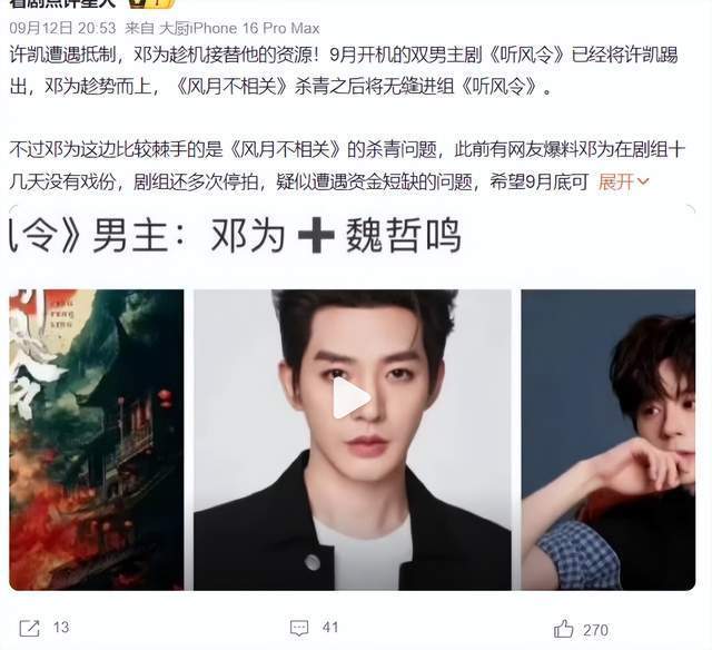 我们都知道,许凯的相关话题连续登上热搜,这样的情况出现,许凯的事业也受到严重的影响,这部剧的制片人透露,许凯的角色将被换掉,然后又传出邓为要接拍这部剧,饰演“史无名”。
